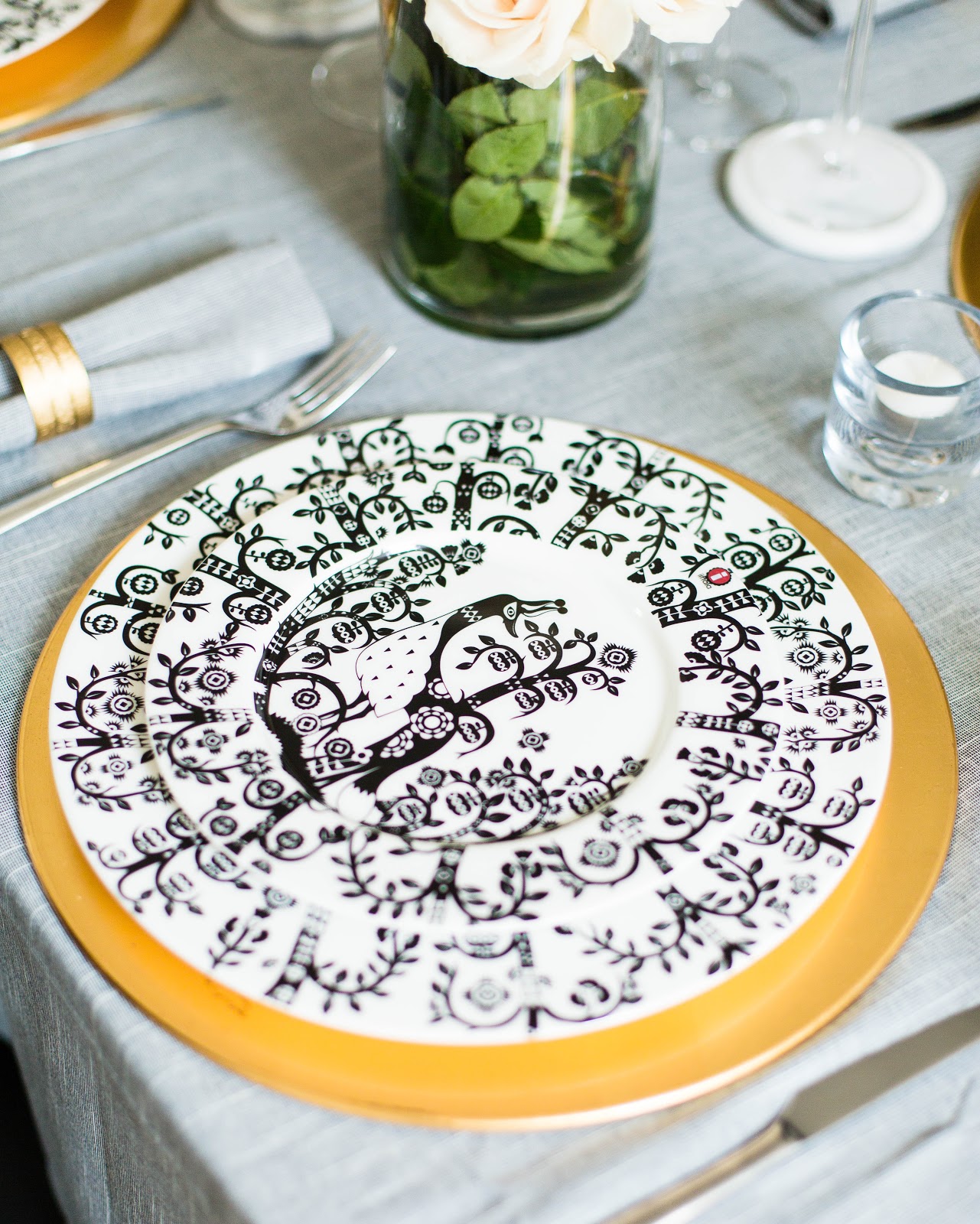 We had some friends over few weeks ago and I loved our table setting so much I thought why not share it on the blog too? Grey is one of my favourite colours right now. Light grey is very versatile and it’s the perfect colour to transition your décor from summer to autumn mode. I pretty much styled our tablescape around this table cloth from H&M Home. Luckily they also had matching napkins to complete the look. Since grey is such an elegant and understated colour, I felt gold accents will bring a bit of glamour to our table setting. I think they work particularly well together in this case because they are two contrasting colours. In my book when you are decorating your table with gold tableware or accessories, it’s a good idea to mix it up with greys, whites or any other neutral colour that you fancy. If all the accessories are gold it might just look a tad tacky, unless you are going for that ‘bling’ New Year’s look of course.