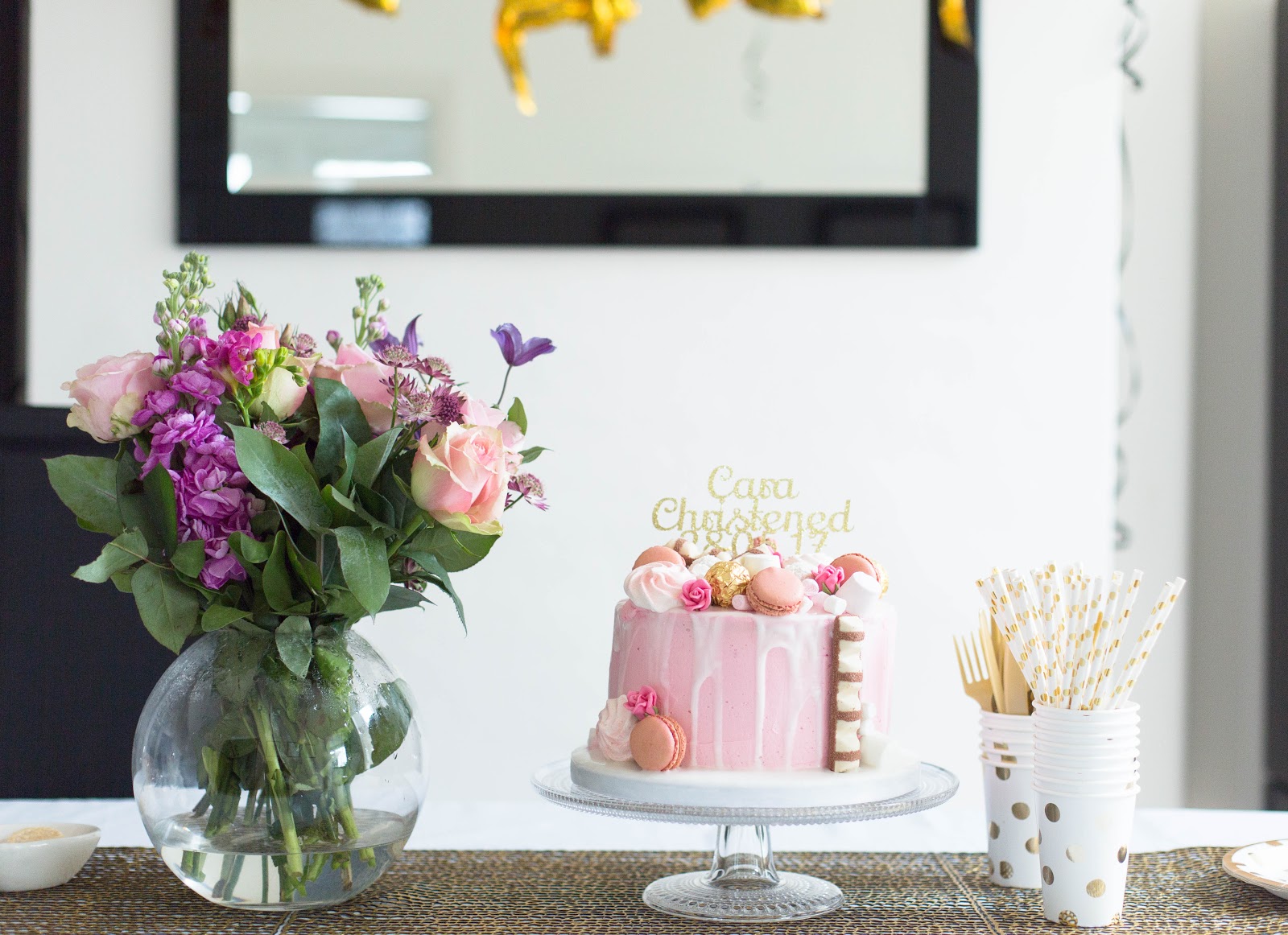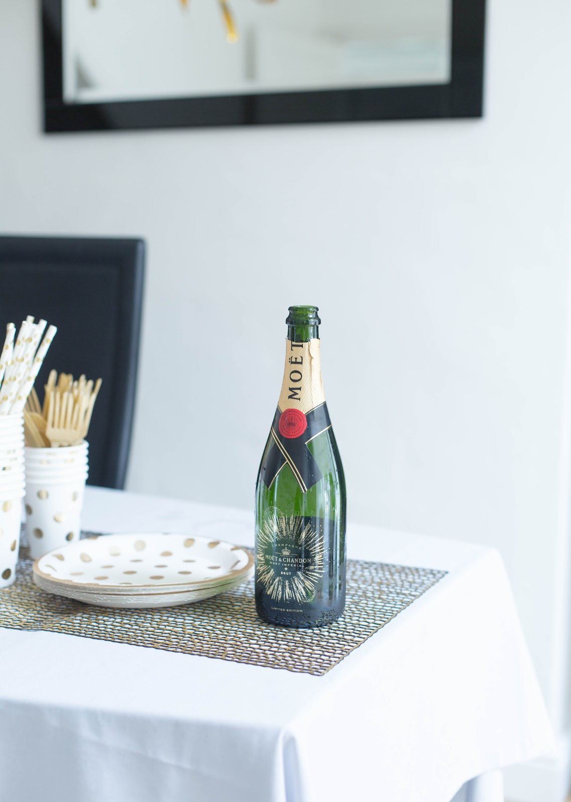 I bought most of our party supplies from Party Delights and their stuff is really great. I’m obsessed with their Gold Polka Dot Range. It looks so chic and classy. I love that you can find matching napkins, cups, plates etc. I had to pop into Hobby Craft for a few missing things but luckily they seem to stock similar items. I really wish I’d have a gold runner but I couldn’t find what I was looking for online so I had to get a bit creative very quickly. I decided to place four placemats together in the middle of the dinner table to create one long runner. You can see where they join close up but from a distance you’d never know. It’s not perfect but good enough for me. Plus I love how the place mats from Chilewich serve double duty as a runner too. I’ll definitely do this trick again.