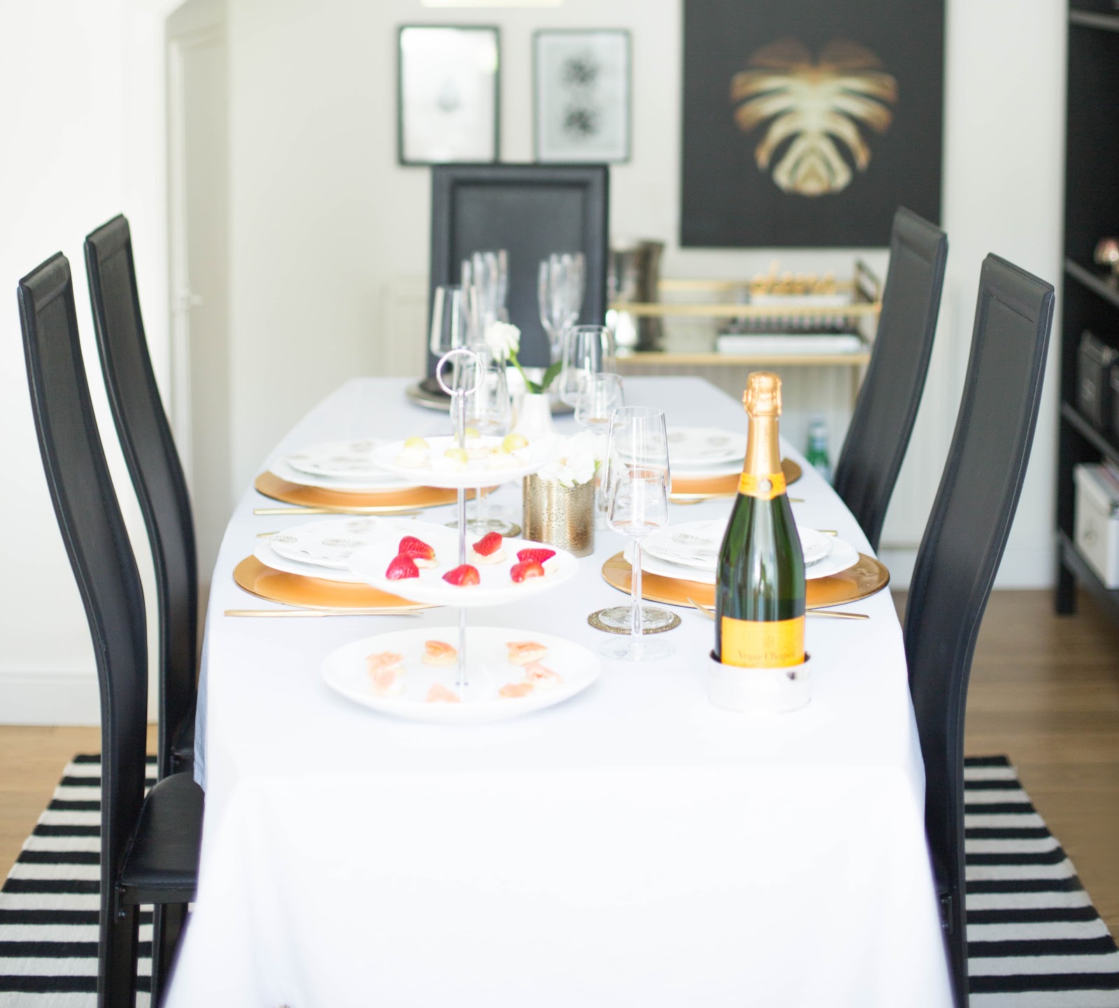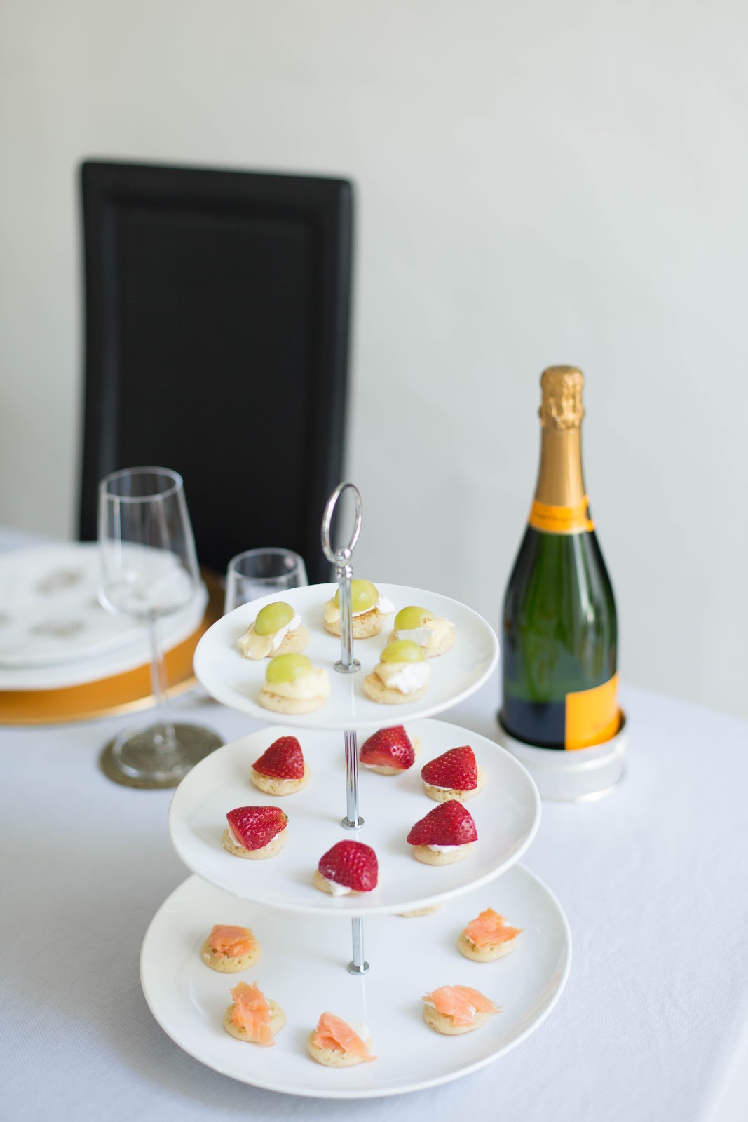 I’m definitely a bit of a foodie, although I’d say all my recipes are super easy. Blinis, also known as Russian pancakes, are my favourite starter. They are so easy to make and really brighten up the table setting. Blinis taste divine with a glass of bubbly, so I totally recommend them if you’re planning to throw a dinner party. I also love using the 3-tier cake stand when entertaining. It saves so much space on the table and looks pretty impressive too. I wanted to pick a summery looking bottle of bubbly for this tablescape and let’s face it, Veuve Cliquet never disappoints. The yellow label brings just the right amount of colour to the table setting.