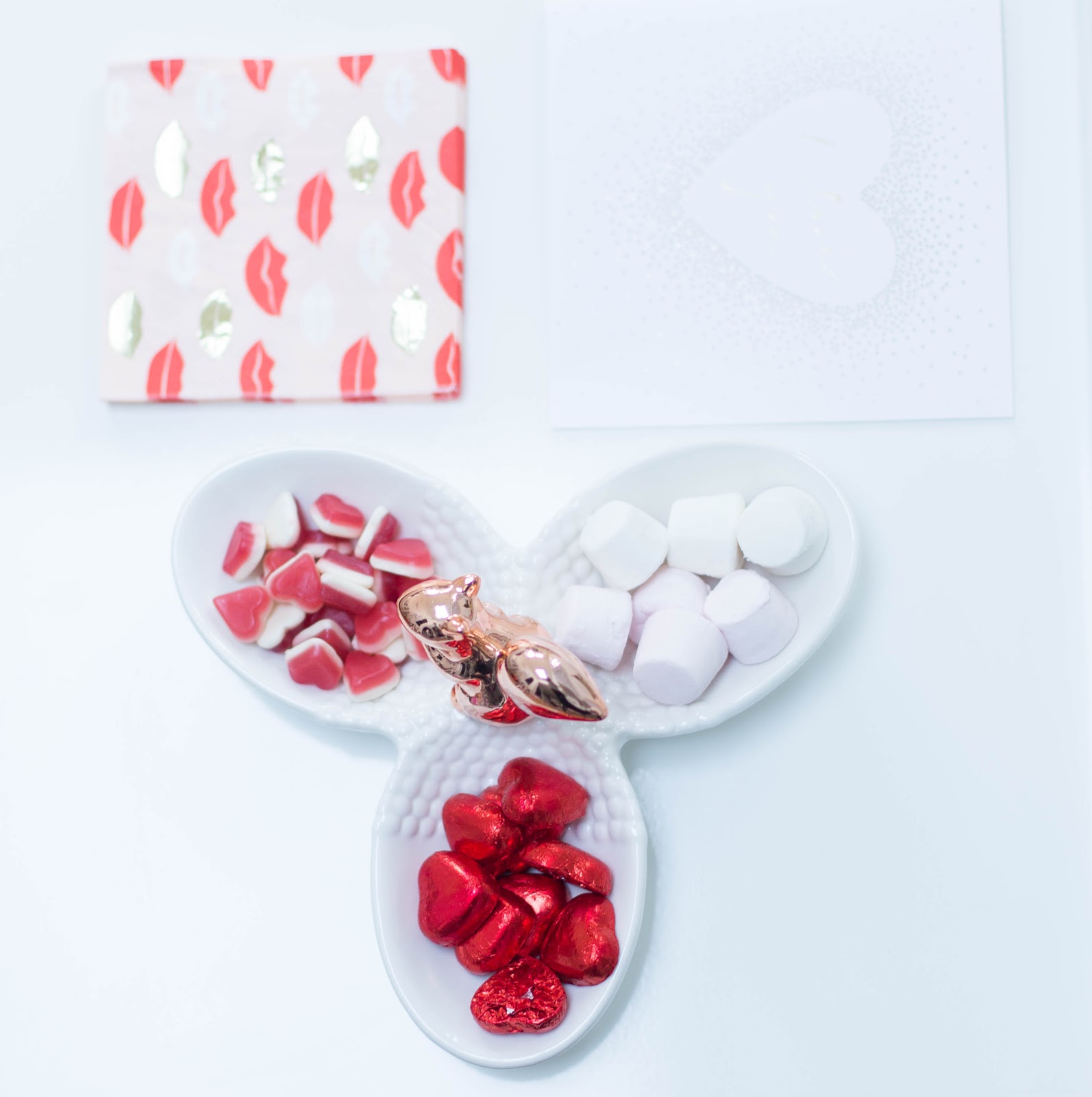 I’m not into sweets, or jellies, but my husband and kids love them so I always get some for Valentine’s. Marshmellows and strawberries go nicely with a glass of champagne and we usually have them as a post dinner snack. I try not to cook on Valentine’s day though. I spend so much time in the kitchen that it’s nice to be able to take a break from cooking, so we usually end up ordering a takeaway. I do prepare a little canapé platter but that’s about it. The lips paper napkins and squirrel serving plate are both from TKMaxx.